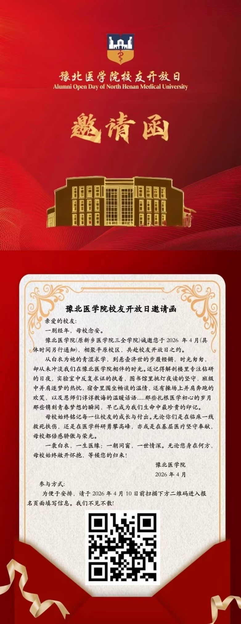 亲爱的校友:一别经年,母校念安。豫北医学院(原新乡医学院三全学院)诚邀您于 2026 年 4 月(具体时间另...